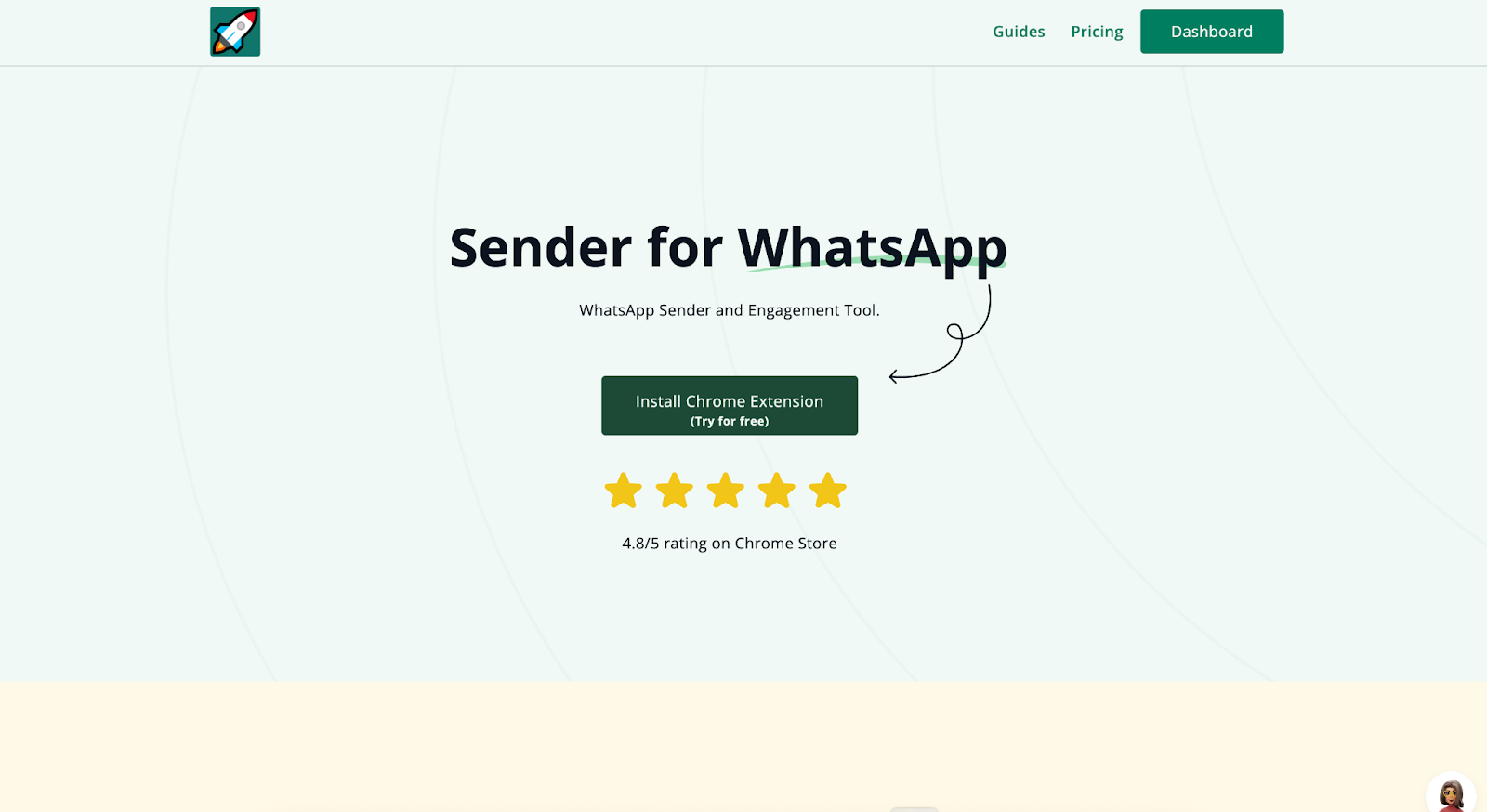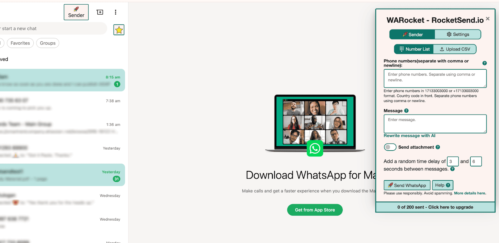 Abrir WhatsApp Web e clique Remetente no canto superior esquerdo para iniciar o painel rocketsend.io.
