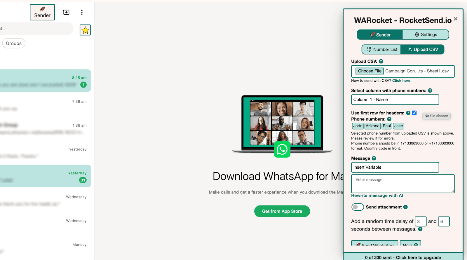 - Para um toque mais humano, ative atrasos de envio opcionais nas configurações para espaçar as mensagens, imitando o ritmo natural da conversa. A interface simplificada do RocketSend mantém você totalmente dentro do WhatsApp Web, facilitando a execução da campanha.